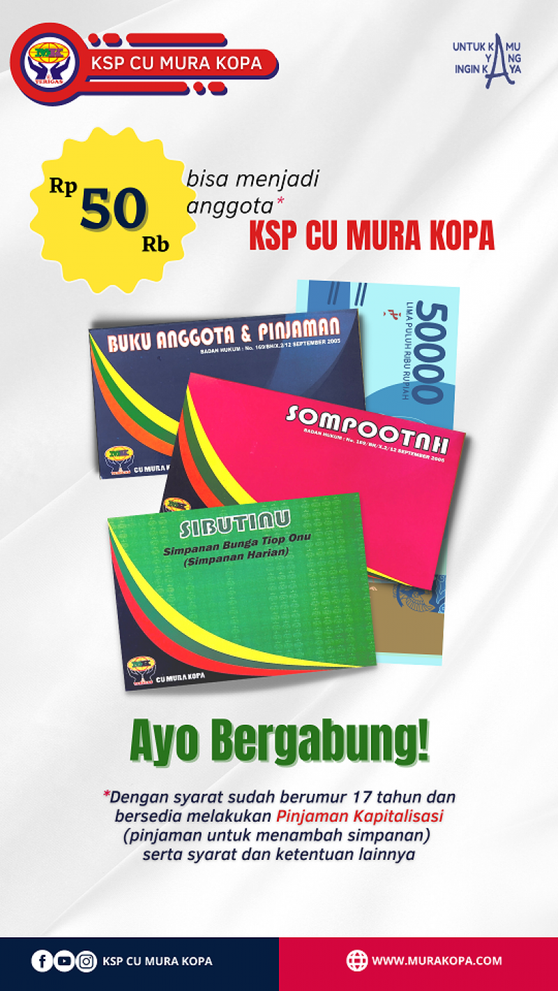 Selamat datang dan selamat bertemu pada website CU MURA KOPA. Mari kita manfaatkan ruang website ini untuk meningkatkan komunikasi, interaksi diantara kita sehingga segala informasi mengenai perkembangan CU MURA KOPA dan anggota dapat diperoleh dengan mudah dan cepat lewat media yang sangat berguna ini.